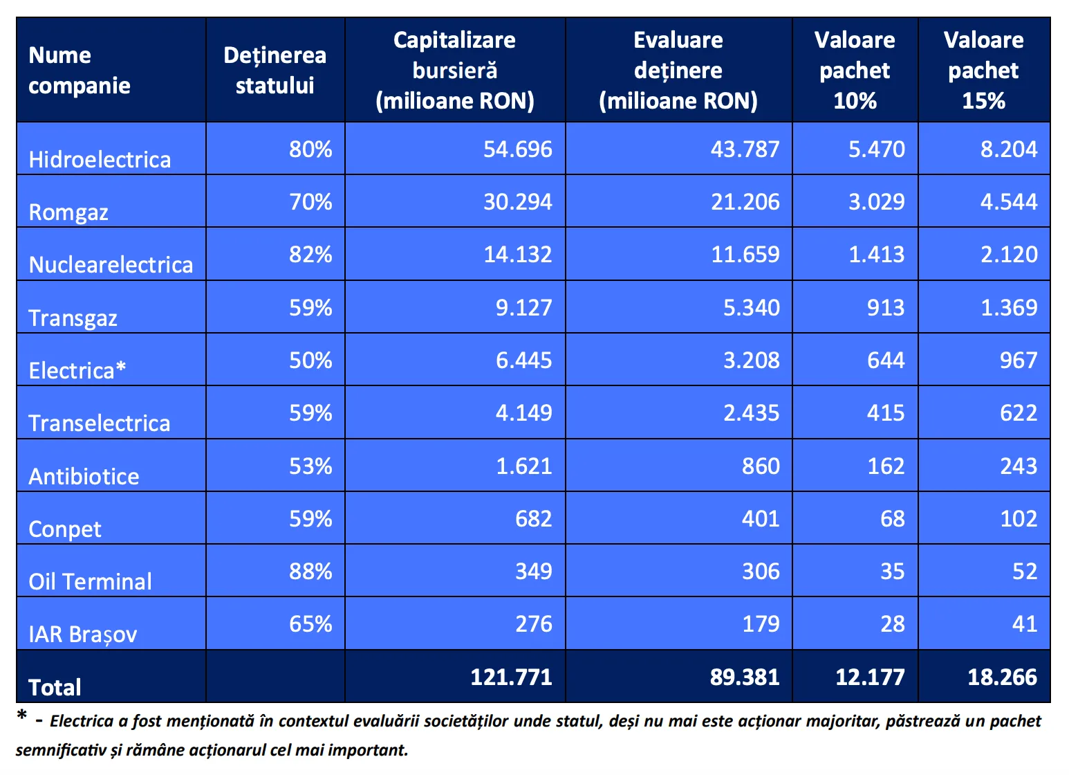 Spre exemplu, în cazul Hidroelectrica (H2O), statul deține aproximativ 80% din companie, prin Ministerul Energiei. Vânzarea unui pachet suplimentar de 10-15% ar putea aduce încasări la buget cuprinse între 5 și 8 mld. lei. Statul ar rămâne cu un control majoritar de peste 65% și ar putea încasa în continuare dividende consistente.