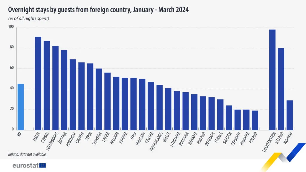 Vizitatorii străini au reprezentat aproximativ 45% din toate înnoptările în primele trei luni ale anului 2024, cu diferențe mari între țările UE. Cea mai mare pondere a înnoptărilor străinilor la începutul anului a fost înregistrată în Malta (91%), Cipru (87%), Luxemburg (82%) și Austria (78%).