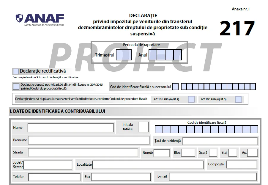 Cum se va completa Formularul 217 destinat impozitului pentru veniturile din transferul dezmembrămintelor dreptului de proprietate sub condiție suspensivă